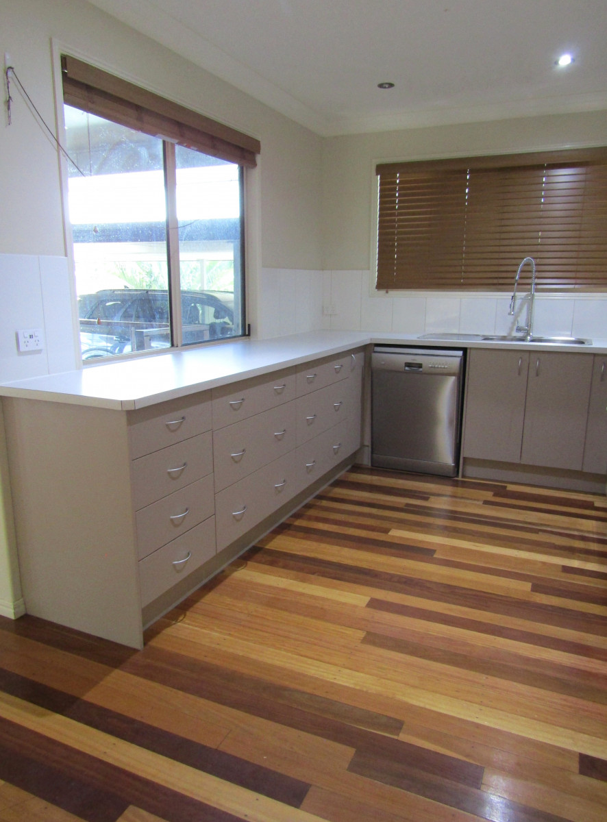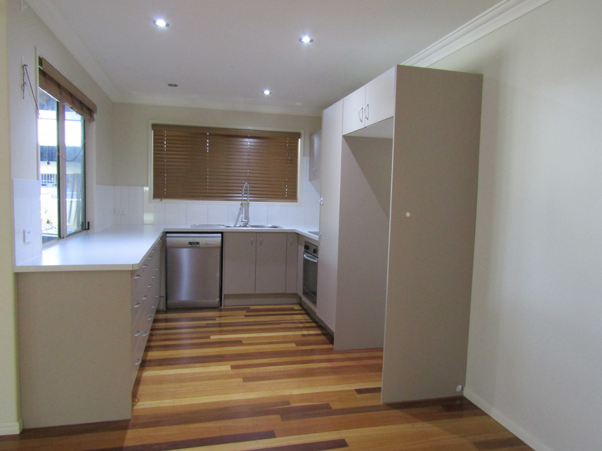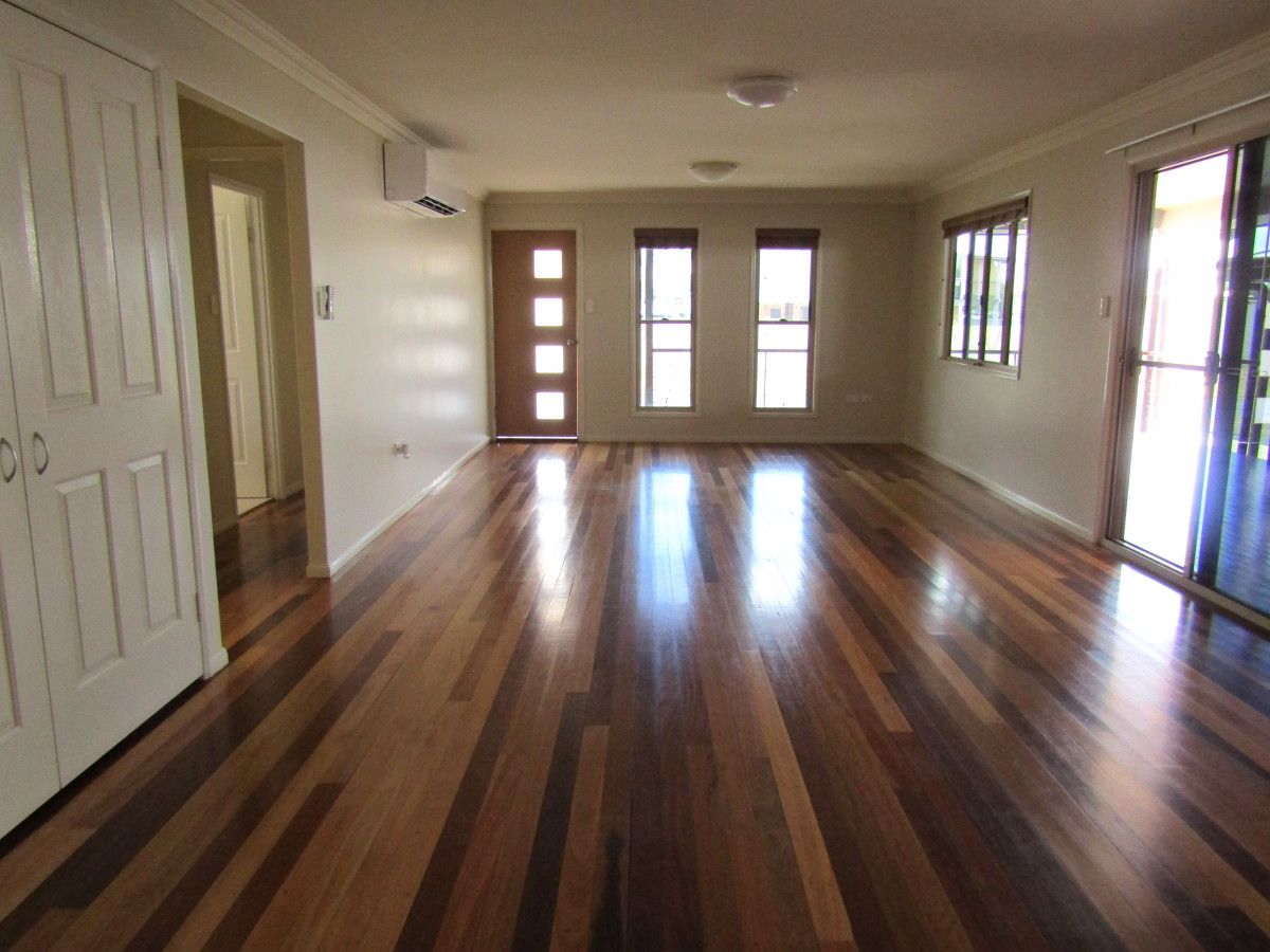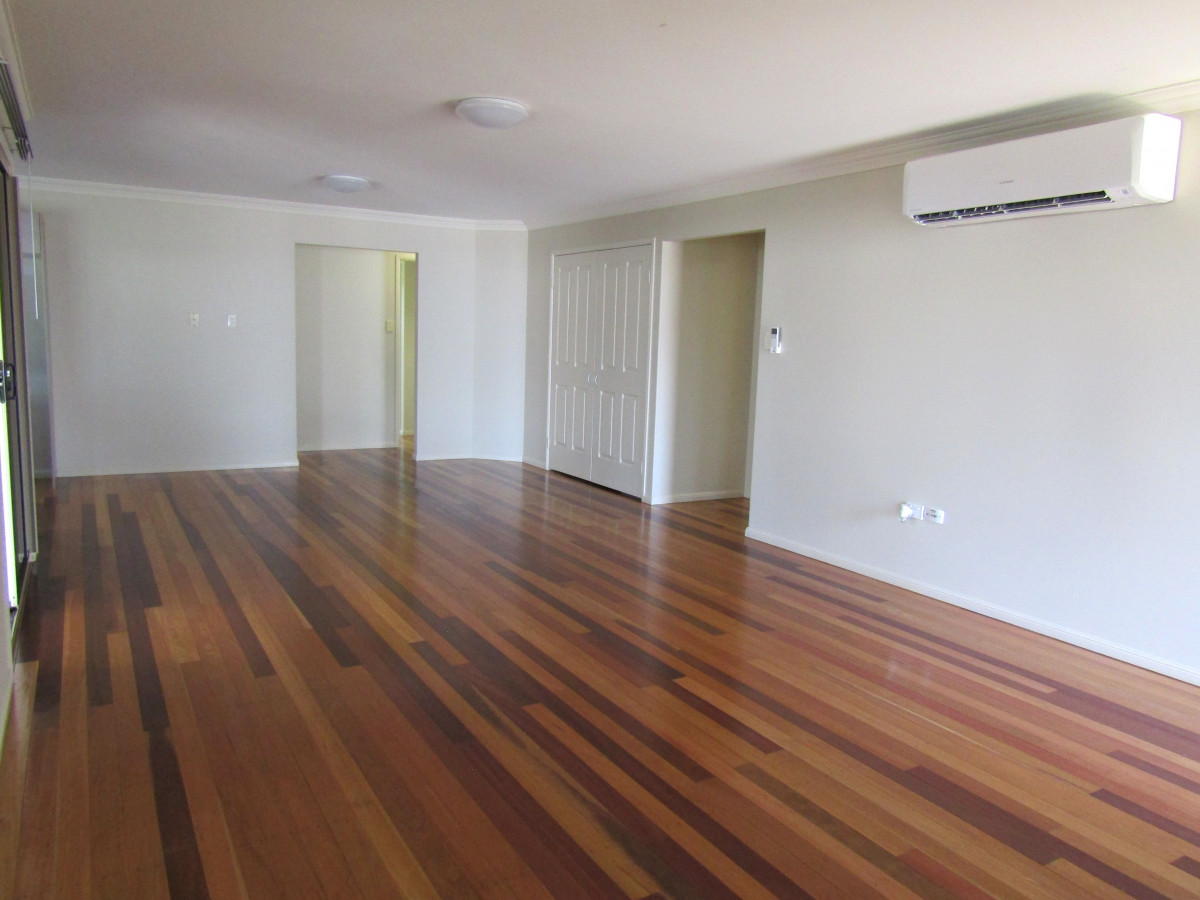 A stand out in the street and vacant possession, this beautiful contemporary home is ready and waiting for a family. Upon entering you are impressed by size of the open plan living and beautiful timber flooring. This will be a comfortable space to come home to. The kitchen overlooks the deck area giving an appealing view for the chef of the family. Excellent bench space and cupboard storage the polished timber flooring gives this light and bright area the ultimate finishing touch. The master bedroom complete with split system air conditioning, multiple door built-in robe has the ensuite close by and separate for that added touch of luxury. The light and airy main bathroom boasts tiled surrounds and flooring, glassed shower cubicle, plunge bath, linen cupboard and vanity unit between with large mirror above. The toilet is separate and located nearby for convenience. The light paint theme throughout makes everything bright and impressive. Tiled flooring to wet areas with timber flooring to complete the remainder for another attractive feature. Air conditioned built-in bedrooms, large storage cupboards in the dining area plus internal laundry completes inside. Stepping from the internal laundry to the side yard concrete path provides ease of access to the back yard. Colorbond fencing surrounds the back yard, garden shed for extra storage, concreted driveway from the front extends through the carport out to the DLUG with extra car parking to the front of it. Carport near the side deck takes care of car accommodation when guests visit. The full driveway with pathway to front stairs completes the picture at this contemporary family home.